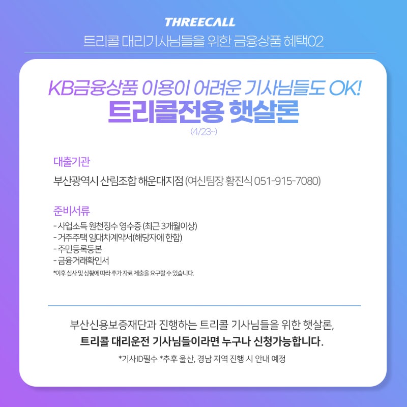 Today’s Posting 대리기사님을 위한 희망뉴스! 산림조합 햇살론 OPEN! 트리콜 대리기사를 위한 산림조합 햇살론