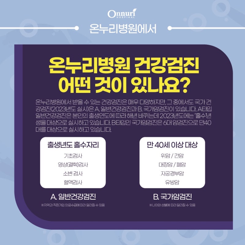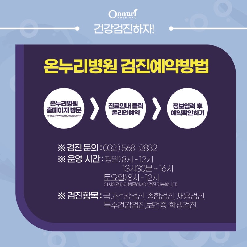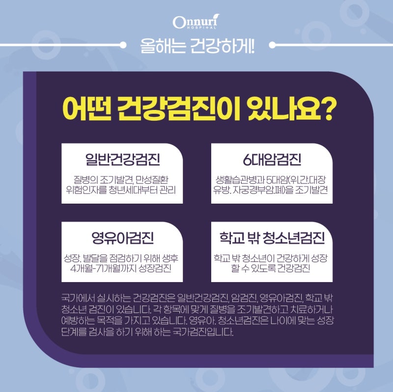 안녕하세요. 새해가 밝았고 모두가 새해 결심을 하고 있습니다. 올 한해도 모두 건강하시길 바라며 인천종합병원 온누리병원 국민건강검진 공지드립니다.