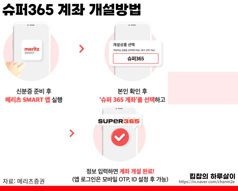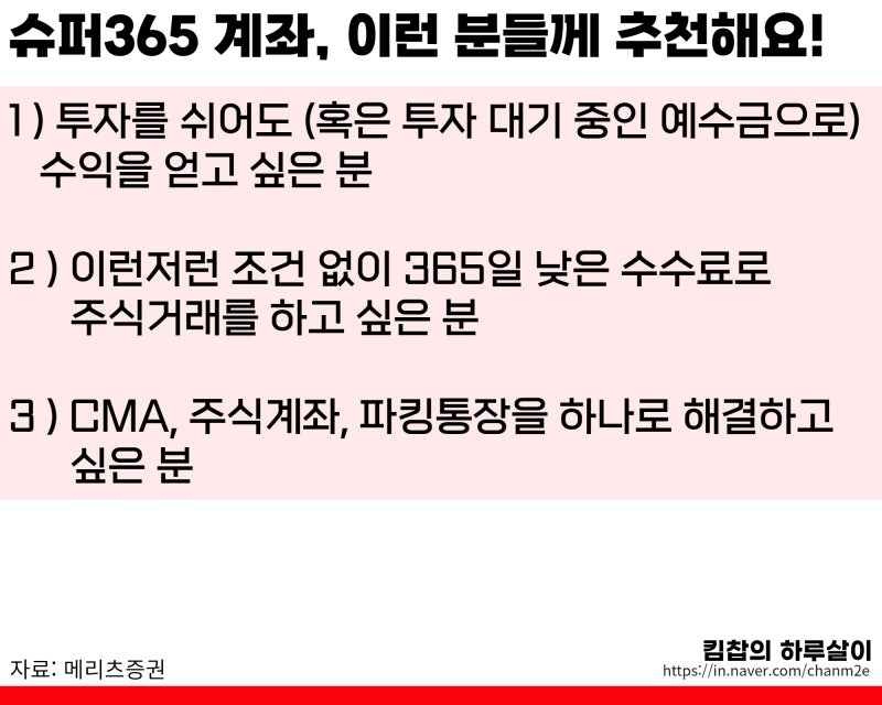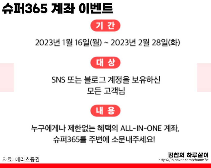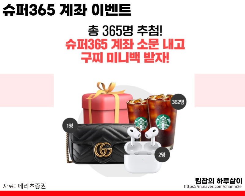 ② 입금액 무제한 두 번째 혜택! KRW와 USD 모두 입금액 외에 잔고에서 무제한 RP 수익을 얻을 수 있습니다. ③ 누구나 무조건 계좌를 개설할 수 있습니다. ④ 올인원 올인원 계좌투자 슈퍼365계좌, 국내주식, 해외주식, 소수거래, 채권, 펀드, 레버리지투자를 하나의 계좌로! 수수료 수준은 국내 0.009%, 해외 0.07%, 국내 채권 0.015%, 우대환율 90%로 합리적이다. 시장 분위기가 좋지 않을 때 돈을 저축하고 자금을 마진으로 잠그기 위해 기다려야하지 않습니까? 이점. 메리츠종금증권 SMART 앱을 통해 Super 365 계좌의 일일수익을 매일 확인하실 수 있습니다 Meritz SMART 앱 좌측하단 메뉴 > 금융상품 > ‘Super 365’ > Super 365 소득확인 추천주식계좌 Super 365 계좌개설방법이 있다면 만 19세 이상 한국인 계좌 개설에 특별한 조건은 없습니다. 메리츠 SMART MTS 앱을 통해 비대면으로 증권계좌 등록 및 개설이 가능하며, 앱스토어 또는 앱마켓에서 ‘메리츠종금증권’을 검색하시면 메리츠종금증권을 쉽게 찾으실 수 있습니다. 구글플레이 https://play.google.com/store/apps/details?id=com.imeritz.smartmeritz&hl=ko&gl=US&pli=1 앱스토어: https://apps.apple.com/kr/app/%EB %A9%94%EB%A6%AC%EC%B8%A0스마트-%EA%B3%84%EC%A2%8C%EA%B0%9C%EC%84%A4-%EA%B2%B8%EC %9A%A9/id1104272974 ① 본인 명의의 신분증 및 통장 준비 ②본인 확인 후 “Super 365 Account” 선택 ③ 정보 입력 매우 간단 현재 Super 365 계좌 입소문 활동 진행중인 제품을 보면 유혹적입니다. 362) 사은품은 개인 SNS 또는 블로그 계정으로 이벤트를 홍보한 365 고객에게 증정되며, 기간은 2023년 2월 28일(화)까지다. 참여 방법은 간단합니다. Step 1) 이벤트 페이지에서 URL을 복사하고 홍보할 SNS 종류를 클릭한 후 게시물을 작성합니다. Step 2) 아래 2개의 필수 해시태그를 사용하여 공개 게시물로 공유하기* 반복 참여 가능 Step 3) 구글폼에 링크를 남겨 게시물 및 참여정보 공유하기 이벤트 페이지 하단의 링크 클릭 시 해당 게시물로 이동 구글폼을 작성하고 참여정보를 입력하면 끝입니다. 이해를 돕기 위해 활성 페이지의 스크린샷을 예시로 찍어봤습니다. 이 게시물이 게시되었을 때 참여해야 했습니다! ! ! 아래 이벤트 페이지 링크를 남겨드립니다. 구찌 가방! 이어폰! 도전! https://meritzevent.com/super365/#sns 메리츠종금증권 슈퍼365 주식계좌 추천 및 주식계좌 개설방법 활동소개입니다. (이 내용은 메리츠종금증권에서 일정 금액의 로열티를 받고 주관적으로 작성한 내용입니다.)