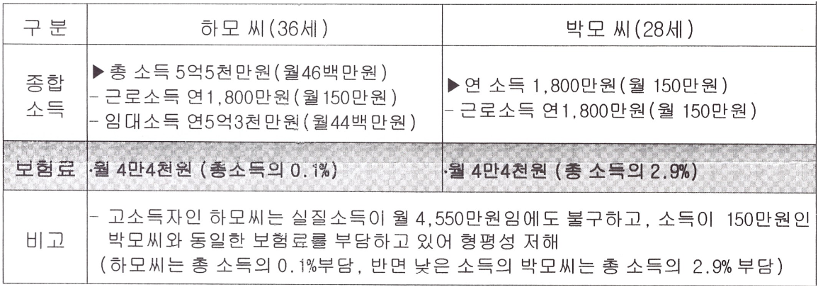 {(연 “무보수 소득” – 2천만원)/12개월} × 소득 평가 비율 × 보험료 비율이지만 소득 평가는 ○이자, 배당금, 사업 등 소득 : 100 % ○ 연금 소득 : 30% 이자, 배당금, 영업수입 및 기타수입, 즉 임대수입, 계산식은 = ((보수수수료 외 수입의 합 – 공제금액)/12) × 보험료 요율입니다.