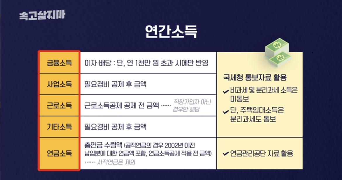 1. 직전(전)년도에 귀속되는 기타소득(이자소득, 배당소득, 사업소득, 기타소득, 급여소득) : 당해연도 11월부터 다음연도 10월까지 적용 2. 연금소득반영기준 전년도 1월부터 12월까지의 소득월액을 합산하여 다음해 1월부터 12월까지의 보험료에 반영합니다.